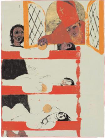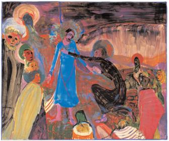 Die Bilder sind expressiv in ihrer Farbigkeit, voll "tiefer Pracht" und zart, empfindsam. Ein Schatz an Erzählungen! So viele Anklänge an Vertrautes – woher? Hier geben – anders als bei den namenlosen früheren Werken - die Titel Hinweis. Die Bilder haben Namen. Und so erkennt man die Herrlichkeit Gottes: nicht glänzend und hehr, eher eine traumatische Gestalt, die an Moses vorüber geht. Vor den Augen der Jünger tastet Thomas ungläubig die Wunden des Herrn. Ausgelassene Stimmung am Palmsonntag, die Geistlichkeit, die schönen Gesichter der Jünger, Partygesellschaft, tanzende Damen, Frack und Zylinder, ein Rucksackreisender, Teppiche werden ausgerollt, Zweige grüßen. Bildumspannende Arme des Heiligen Geistes, in dessen Angesicht die Menschen schamlos schmutzig ihre Körperlichkeit ausleben. Die anmutige Jesusgestalt in Getsemani, verhüllt durch eine diaphane textile Überspannung der Leinwand. Der heilige Nikolaus von Myra wie die Illustration eines Kinderbuches der eigenen Kindheit, in der sich die Sehnsucht nach dem Guten, nach dem Rettenden spiegelt, nach Aufgehobensein. Nikolaus scheint eine Art Lieblingsgestalt, die in rotem Gewand mit Tiara, Bischofsstab und Heiligenschein öfter bei Kai Althoff auftaucht. Eine heulende Alte im Rollstuhl lustlos geschoben von einem jungen Paar, eine einsam melancholische weibliche Gestalt und das Glück des Bekehrten, sein lässig entspannter Körper eingefangen im Netz eines "Menschenfischers".