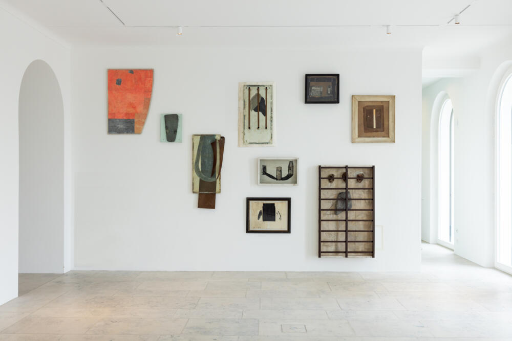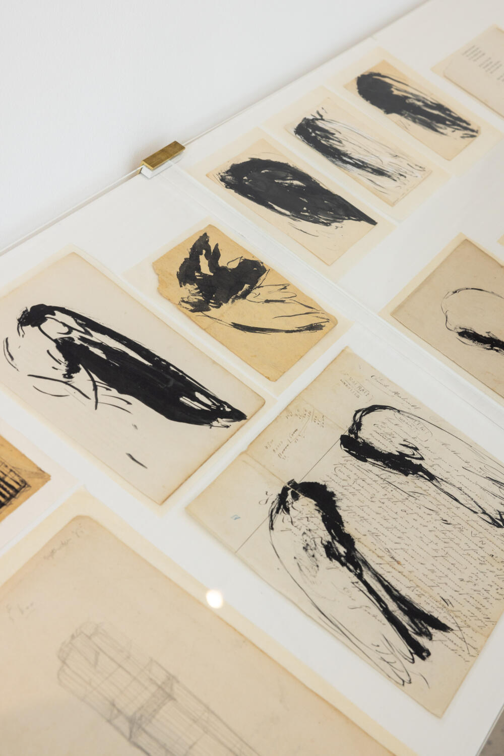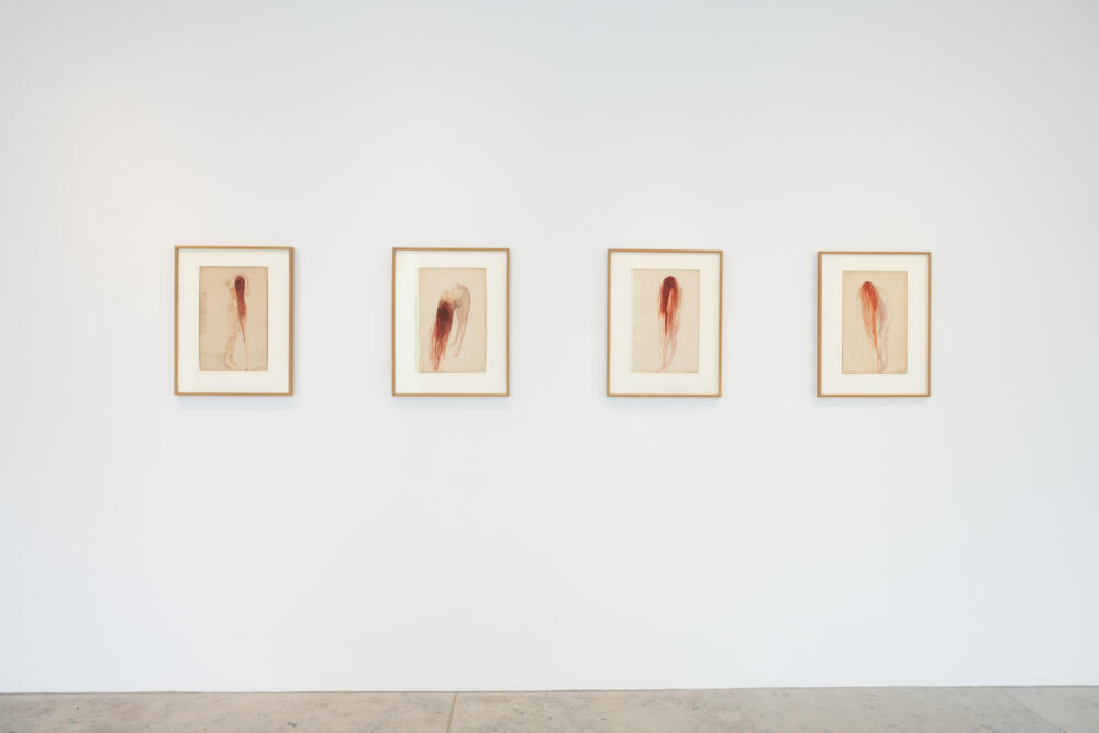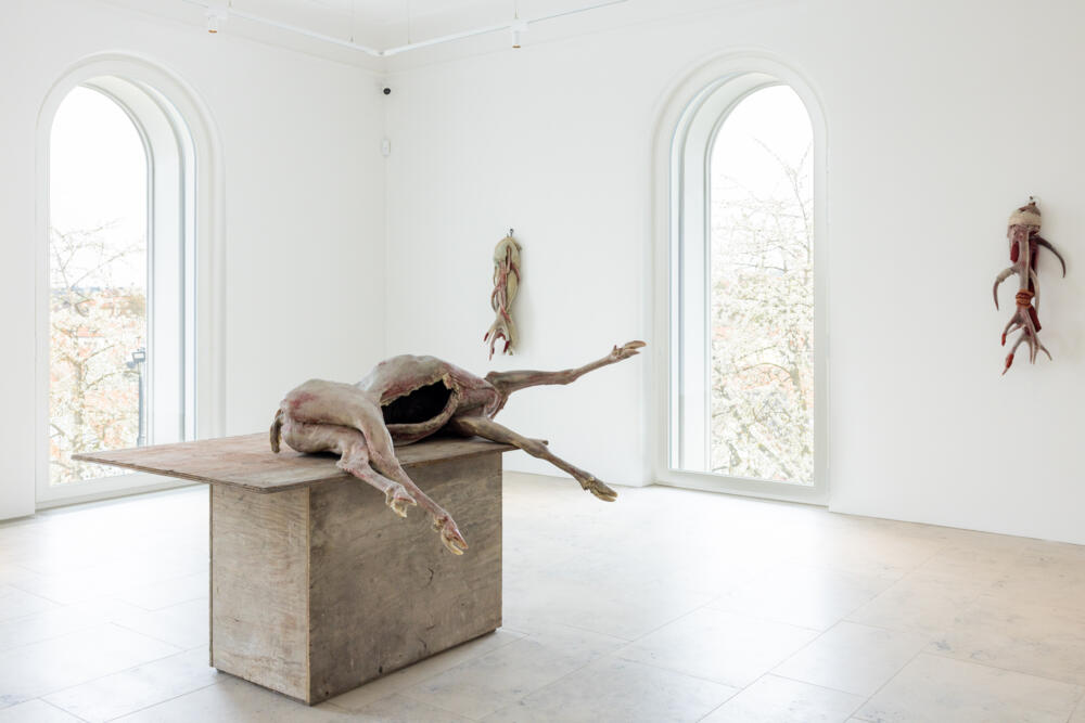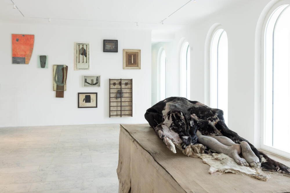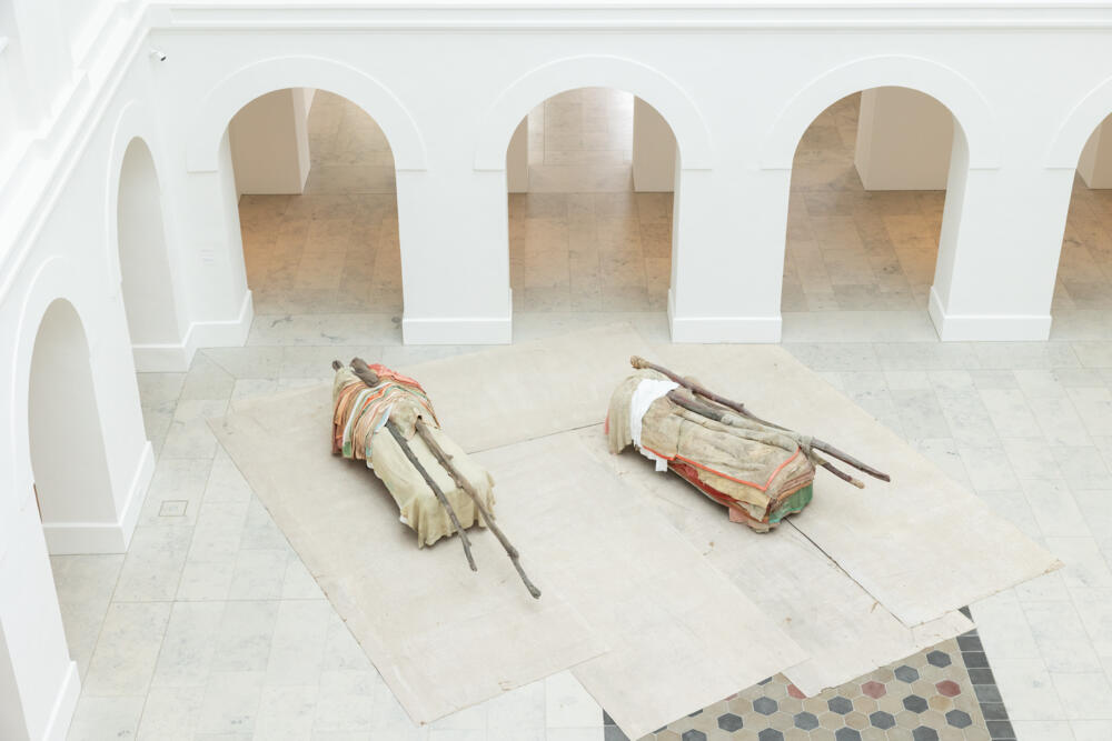 Im Münchner Saal bleibt der Blick auf das Motiv des Engels konzentriert. Die zentrale Gestalt, speziell für diese Ausstellung geschaffen, ist Liggende – Arcangelo III, 2023, ein auf einem Sockel aus gebrauchten Bodenbelägen zusammengebrochener Engel. Er ist umgeben von einer Auswahl sehr früher Arbeiten und Skizzen, die hier zum ersten Mal gezeigt werden und das Thema des Engels wie des Flügels in Berlinde De Bruyckeres Oeuvre reflektieren.