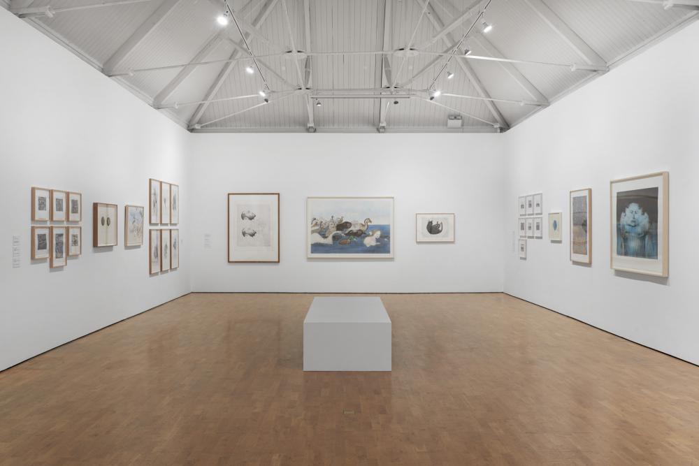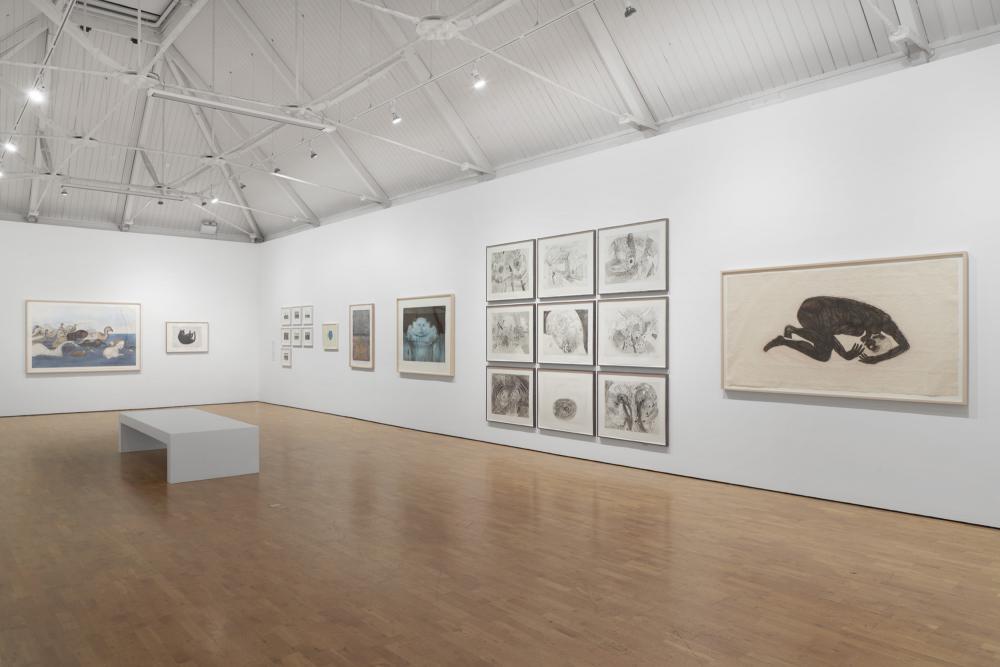 The storytelling of these works corresponds with the narrative structure of the drawings and prints displayed in the exhibition. They unfold an all-encompassing universe of enchantment, spiritual dimension and individual mythology, which explores fairy tales and childhood. How charming to find “Alice in Wonderland” here, who lived as Alice Liddell, daughter of Henry George Liddell, dean of Christ Church, the largest college of Oxford University, just moments away from Modern Art Oxford’s Pembroke Street home.